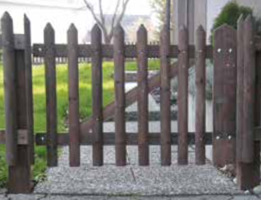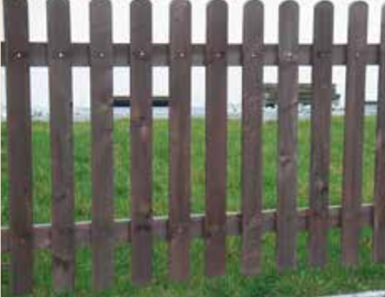Bestehend aus Staketen, vierkant, 25/60 mm mit abgerundetem Kopf, aufgenagelt auf zwei Traversen 4 cm x 7 cm angeschlagen an solid, in’s Erdreich versetzte Pfosten. Druckimprägniert braun, Pfostendistanz ca 2.50 m, Elemente à 5.00 m