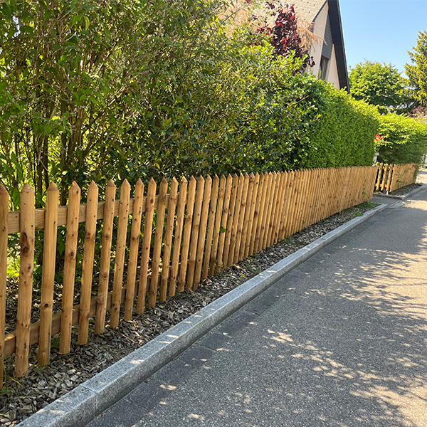 Bestehend aus Staketen, vierkant, 25/60 mm mit abgerundetem Kopf, aufgenagelt auf zwei Traversen 4 cm x 7 cm angeschlagen an solid, in’s Erdreich versetzte Pfosten. Druckimprägniert braun, Pfostendistanz ca 2.50 m, Elemente à 5.00 m